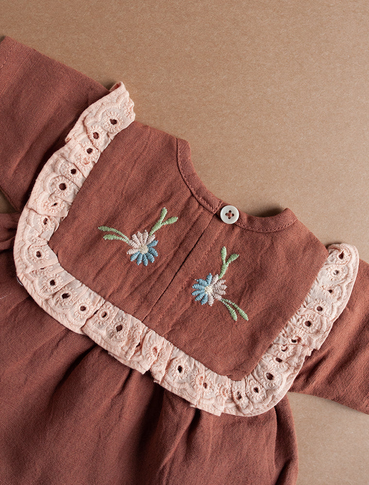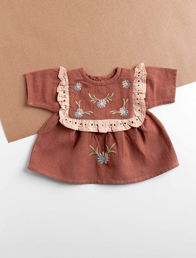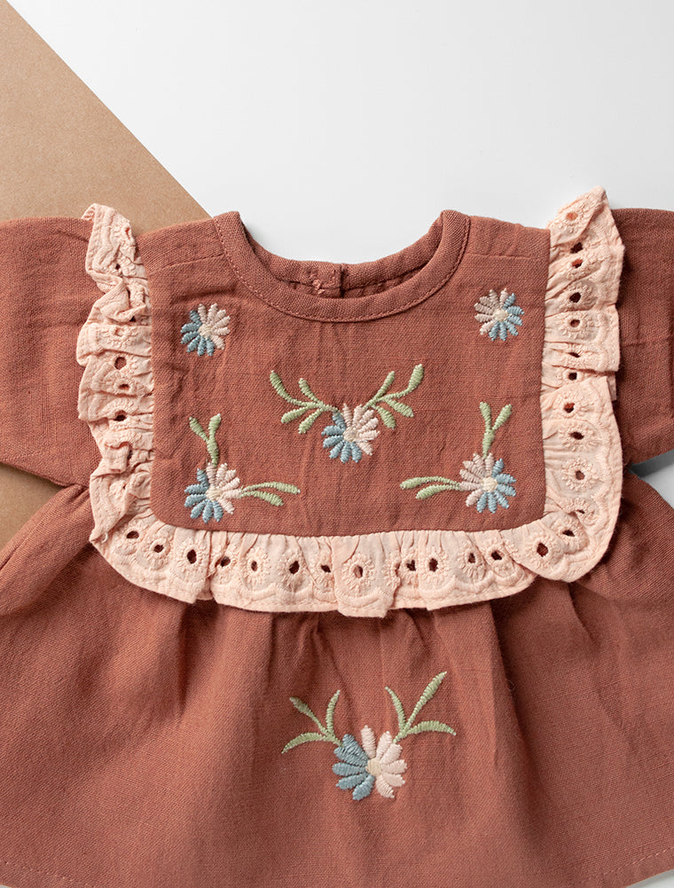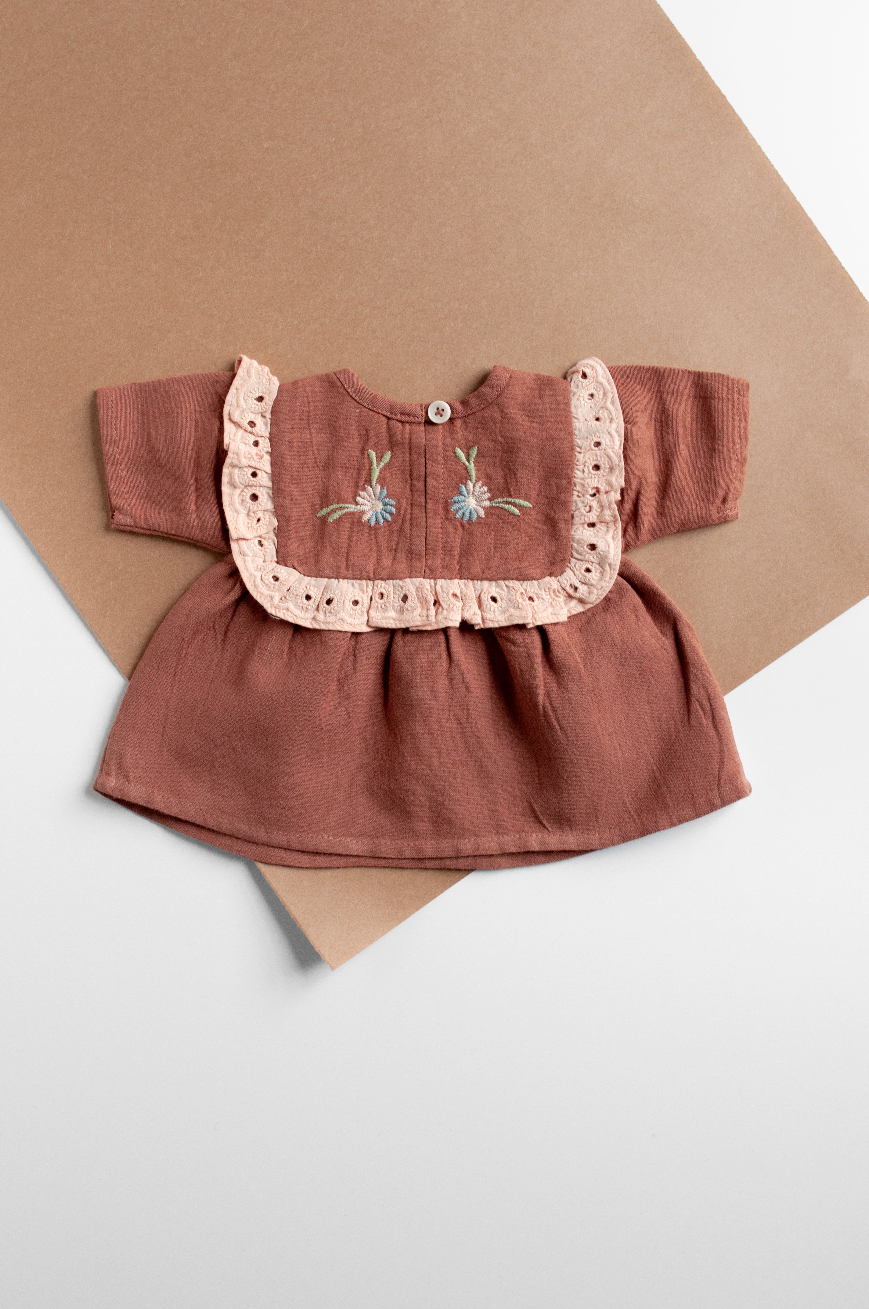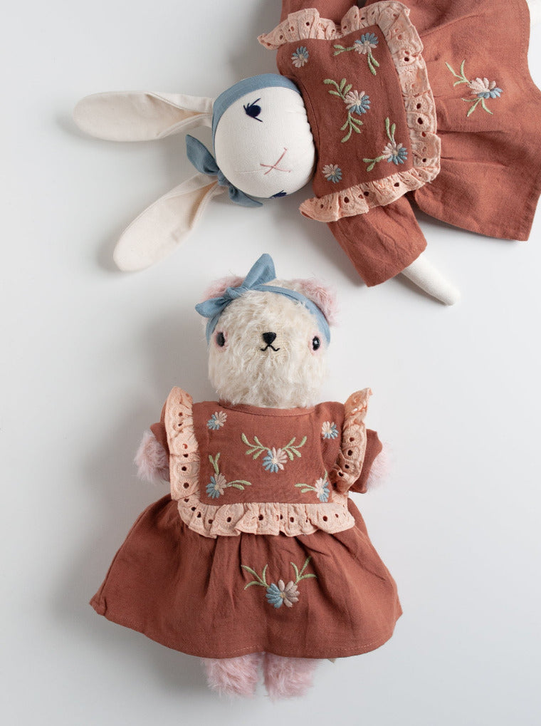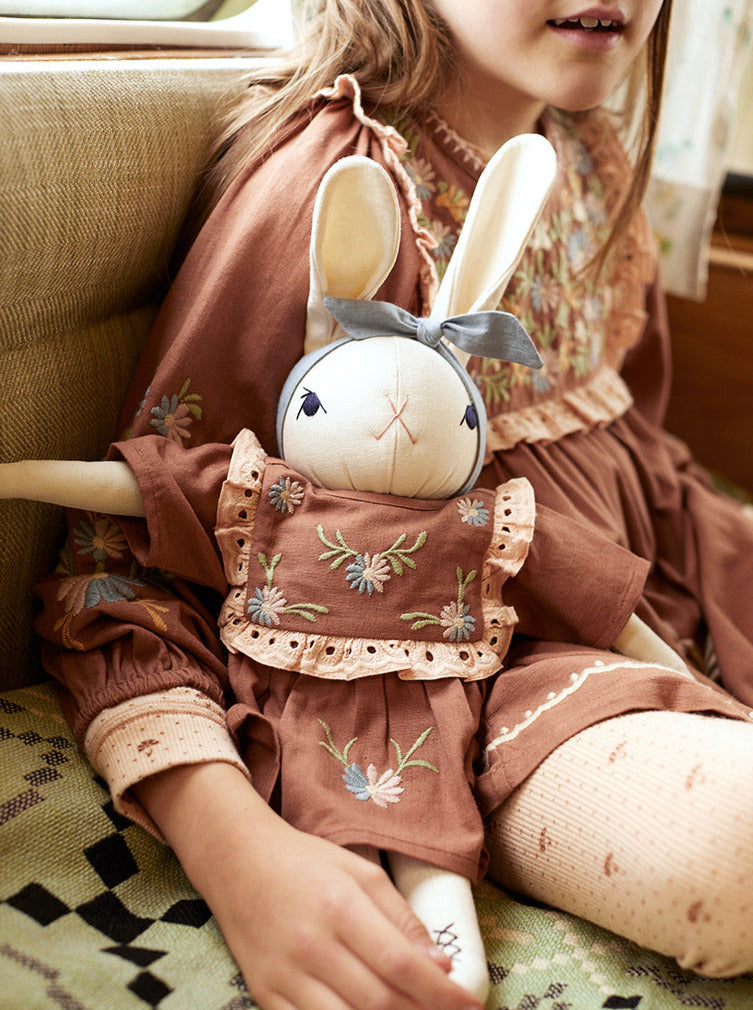 A classic embroidered Apolina dress in made especially for Polka Dot Club. This scaled down dress is made to fit Polka Dot Club large Rabbits & Cats.