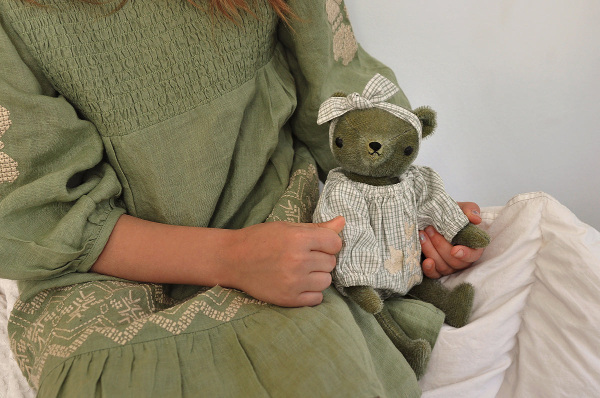 ~ hand dyed Sage mohair fur woven onto a cotton backing~ hand embroidered nose
