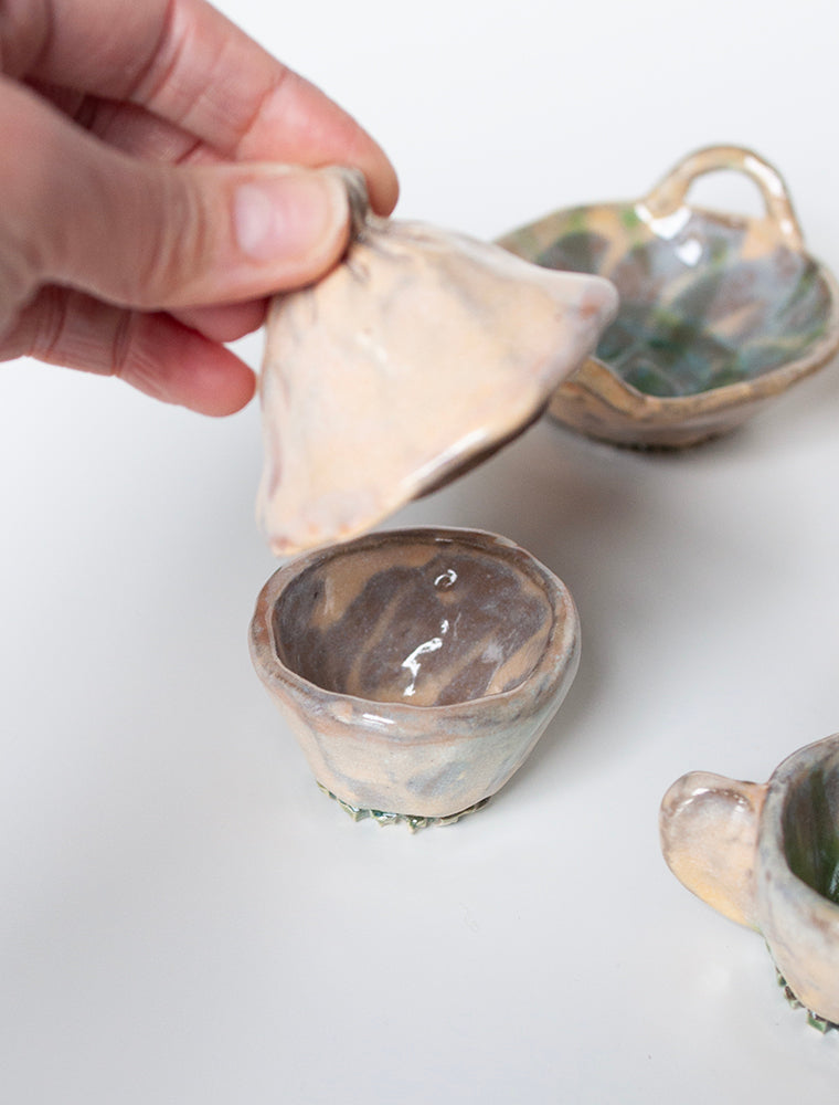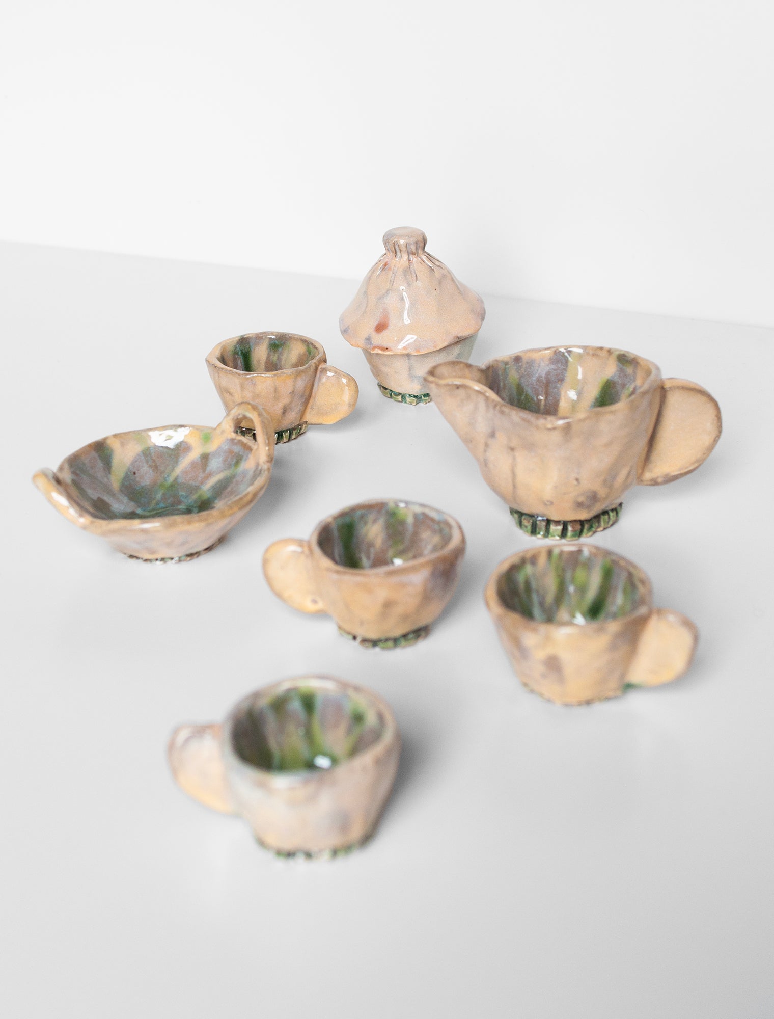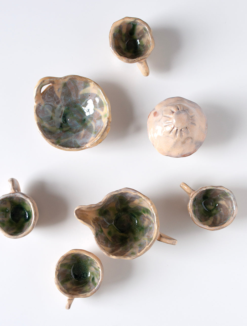 Stoneware, dishwasher safe, food safe, hand built ceramic set. Opaline Coloring with slip work wish washy green bases and inside... cups are 1.5" tall