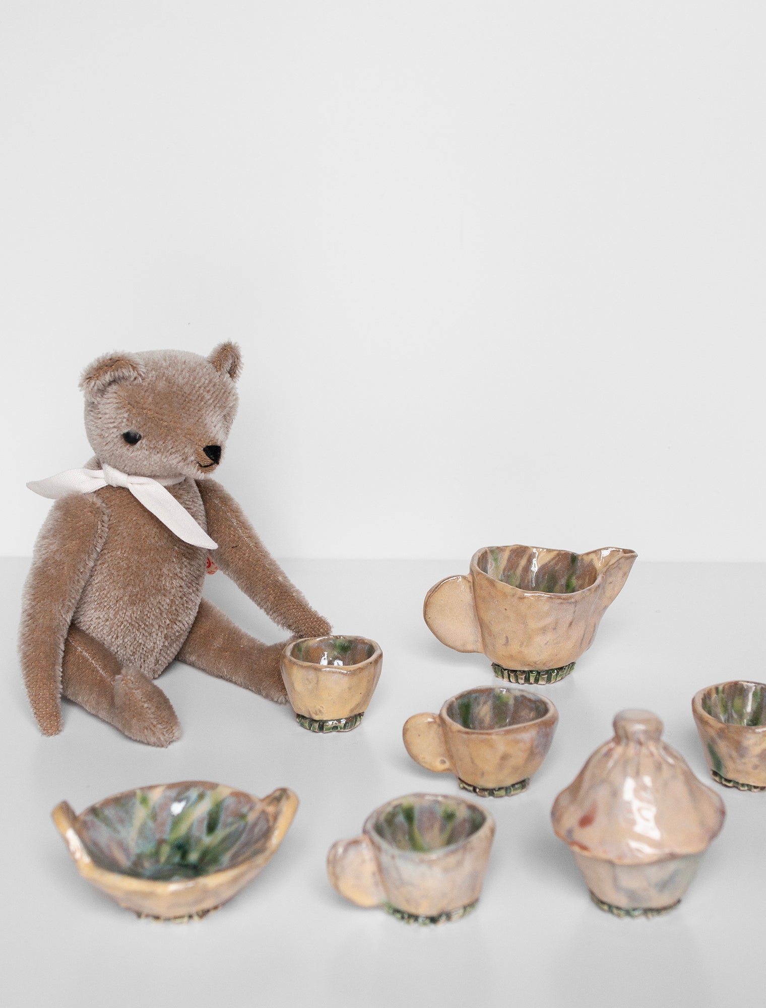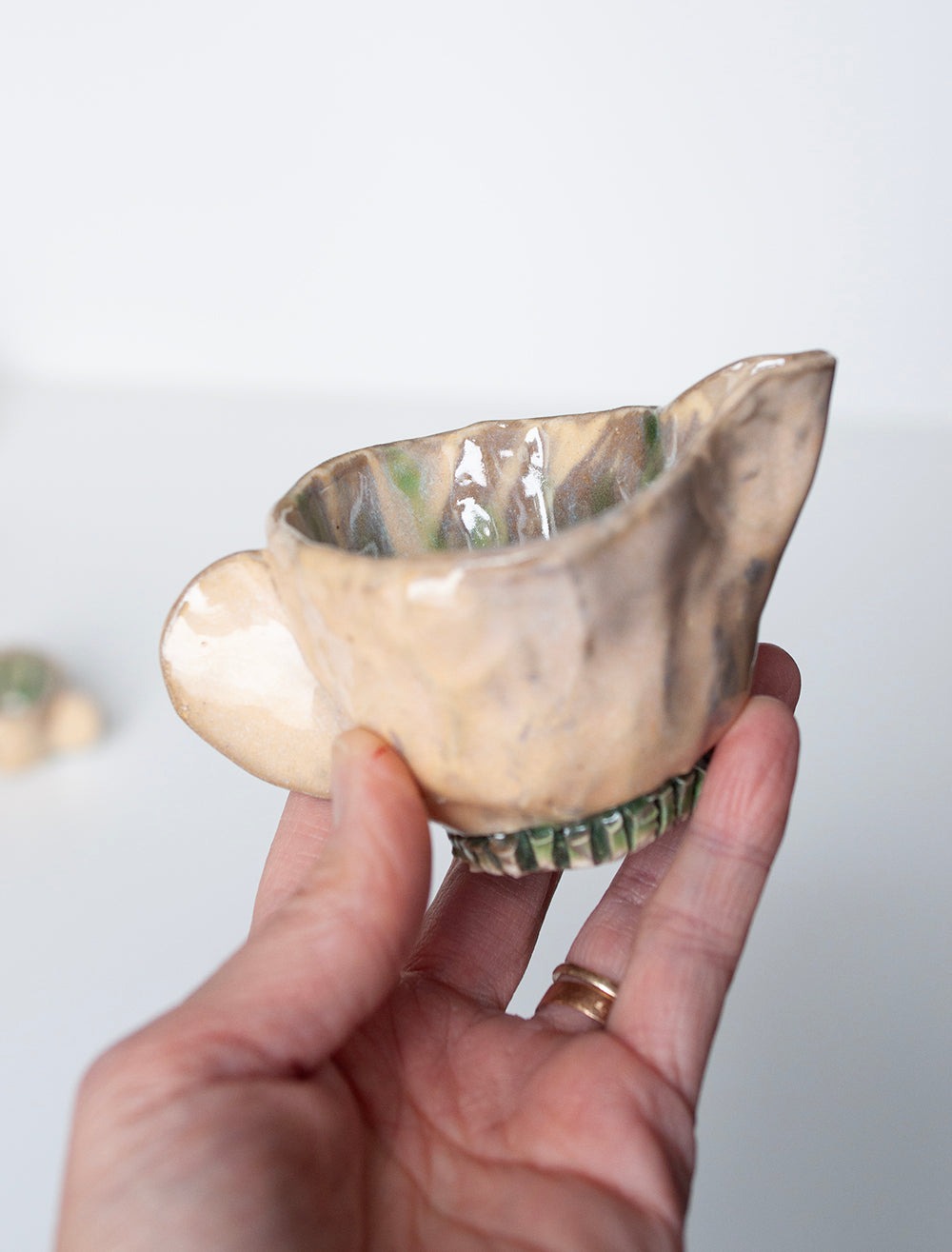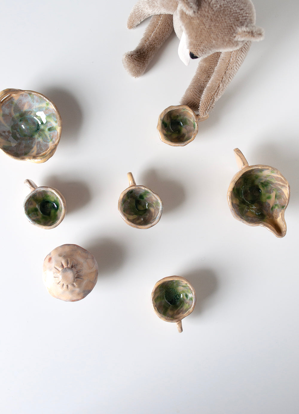 Stoneware, dishwasher safe, food safe, hand built ceramic set. Opaline Coloring with slip work wish washy green bases and inside... cups are 1.5" tall