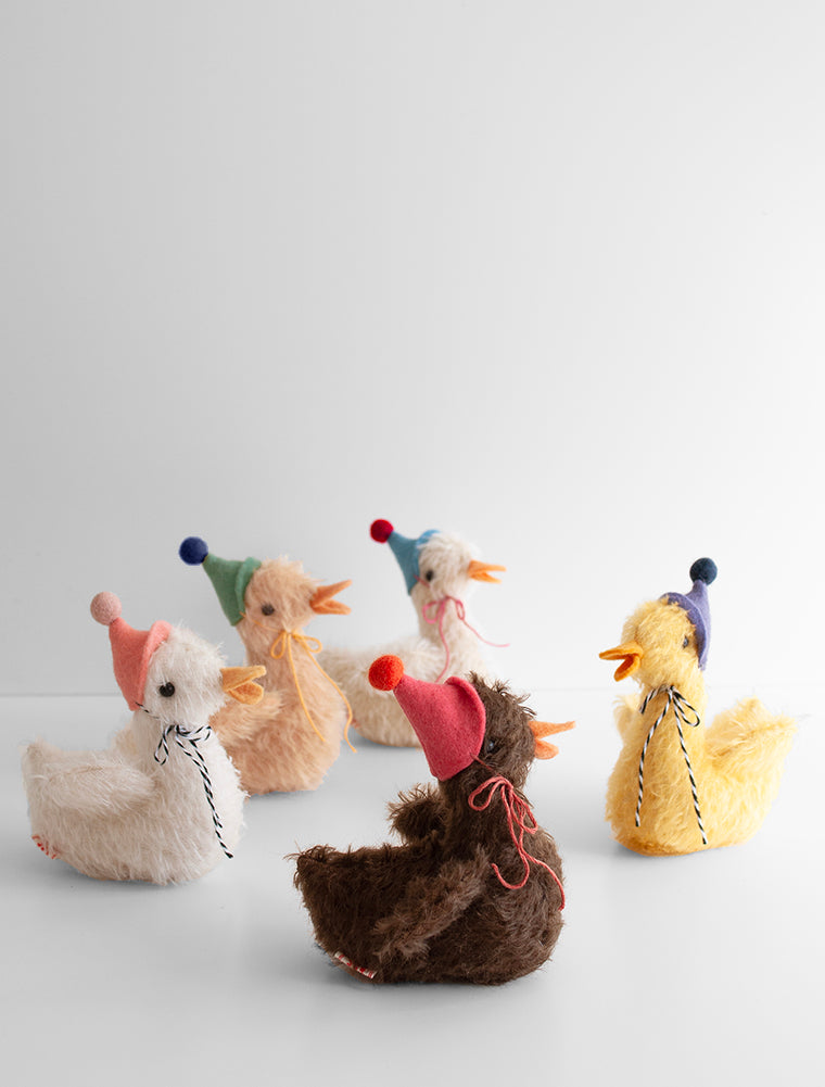 Mohair Ducklings ready for a celebration donning a wool party hat.
