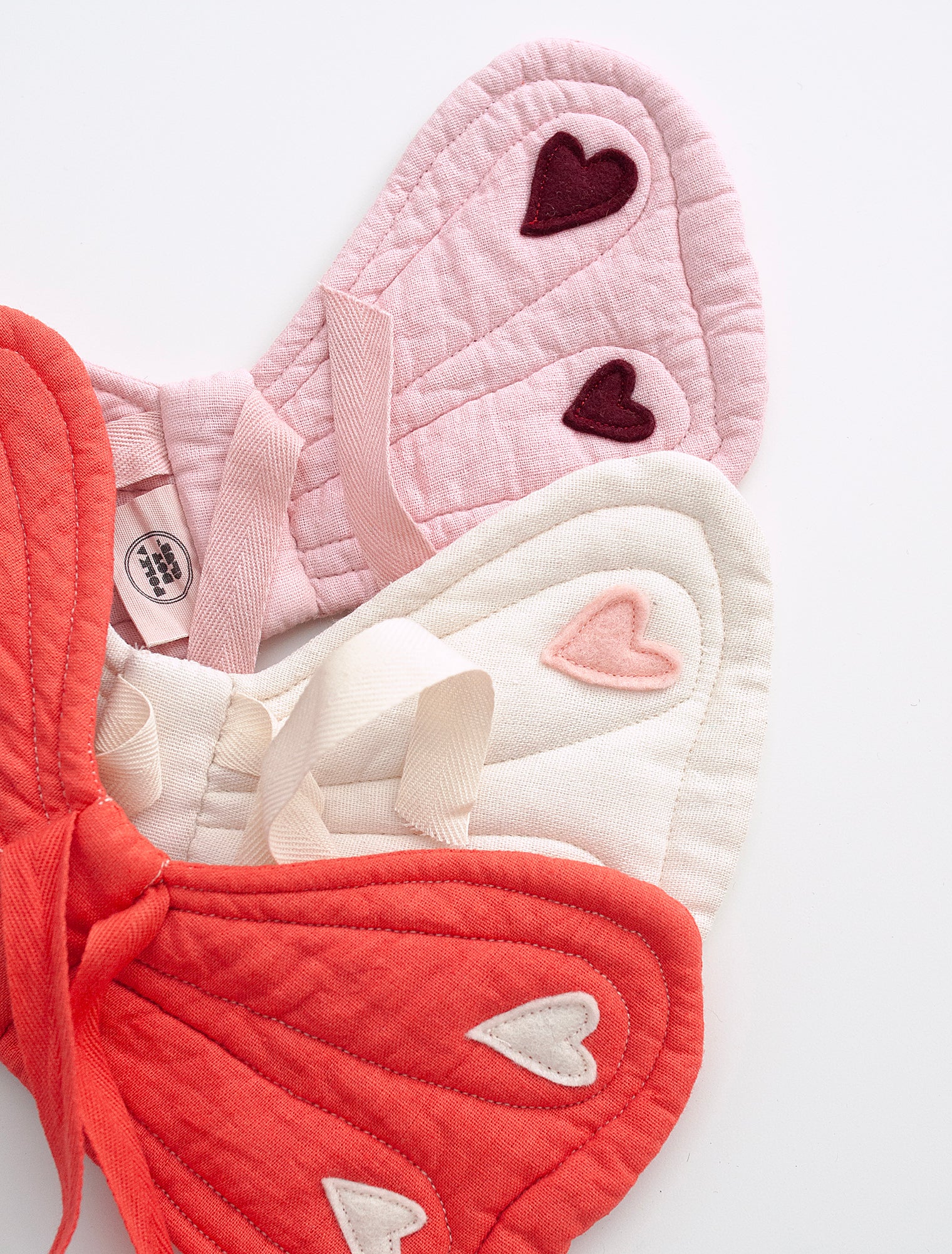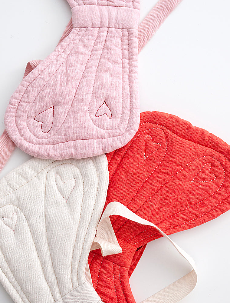 A little imagination goes a long way. Cotton Gauze Butterfly Wings for most PDC Toys. They stay securely in place making them perfect for imaginative play, cuddling, or just for marveling at their cuteness. Wool Felt Hearts top stitched with LOVE.