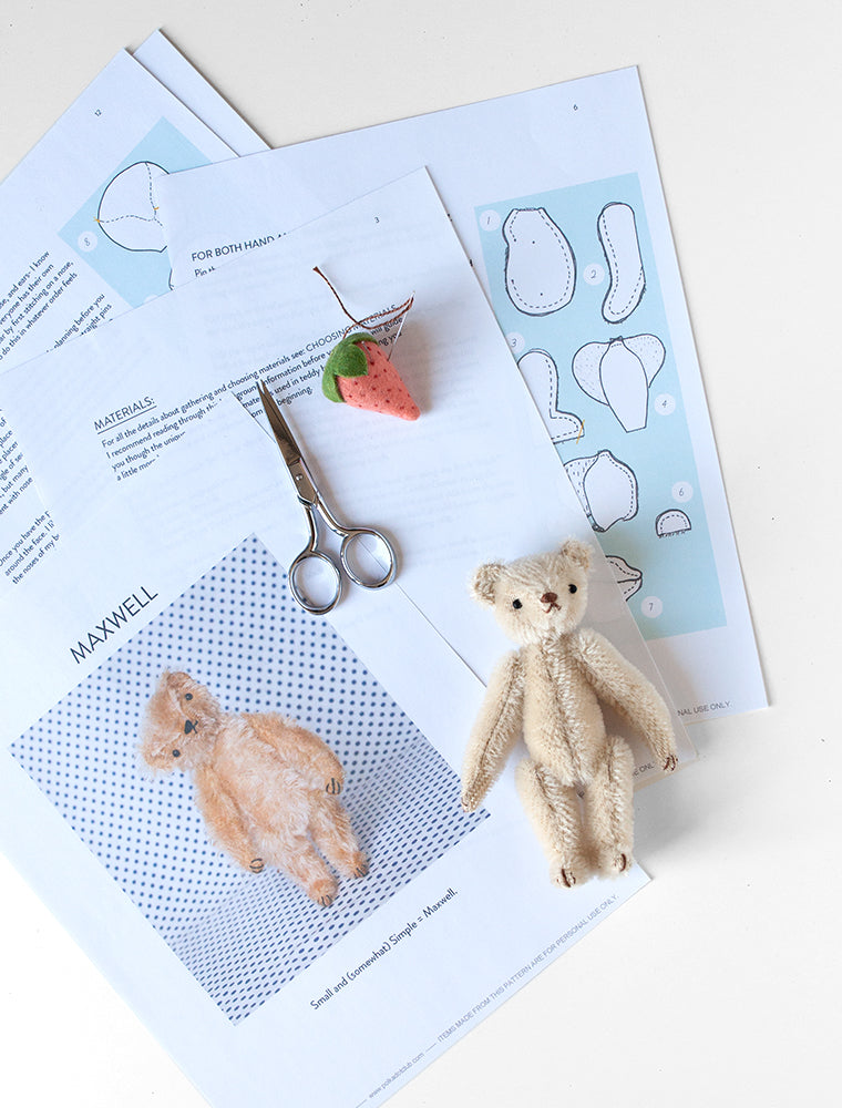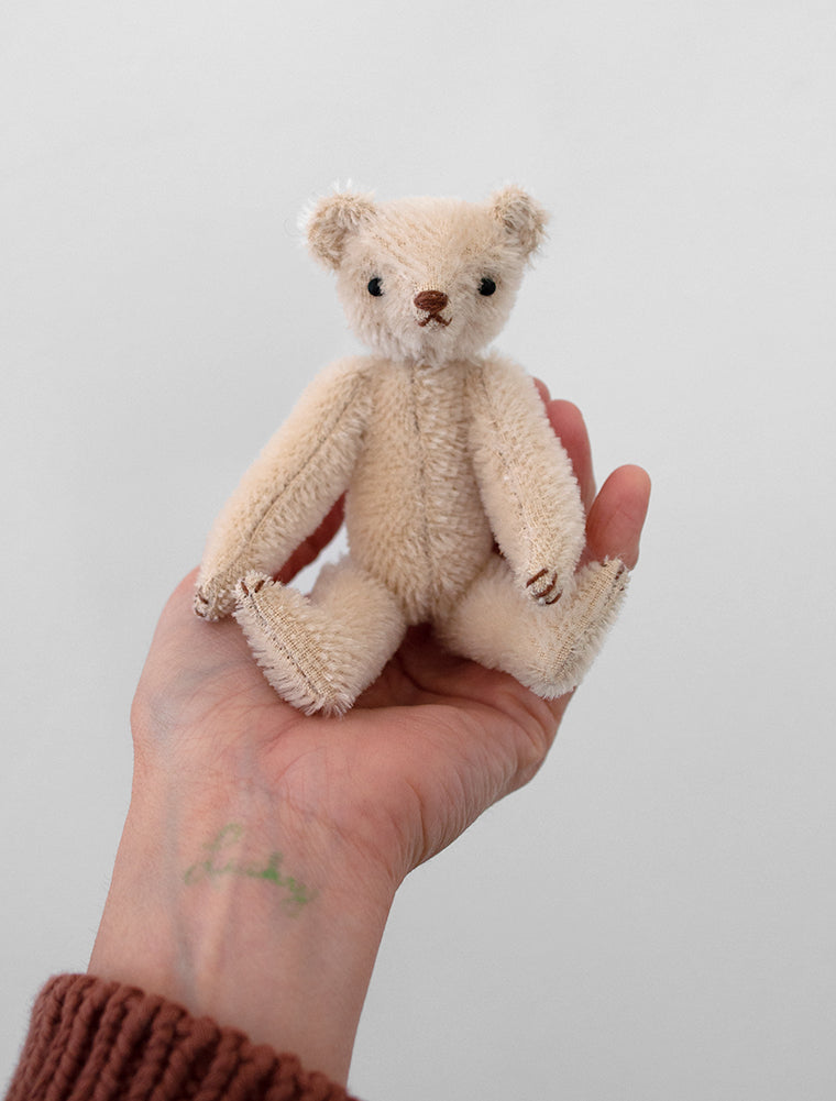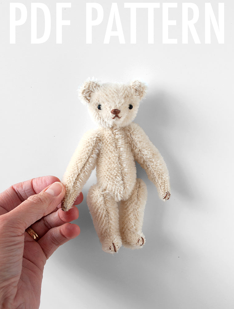 I've been making mohair teddy bears for over 25 years and here's a chance to share some of that knowledge with you. This little bear can be machine or hand sewn. He’s a perfect project for someone who likes to work small and has the patience to do so. The pattern is simple and the detailed instructions- which can be modified to make it more or less complex, make this a good introduction to traditional bear making. The finished bear is about 6" tall.