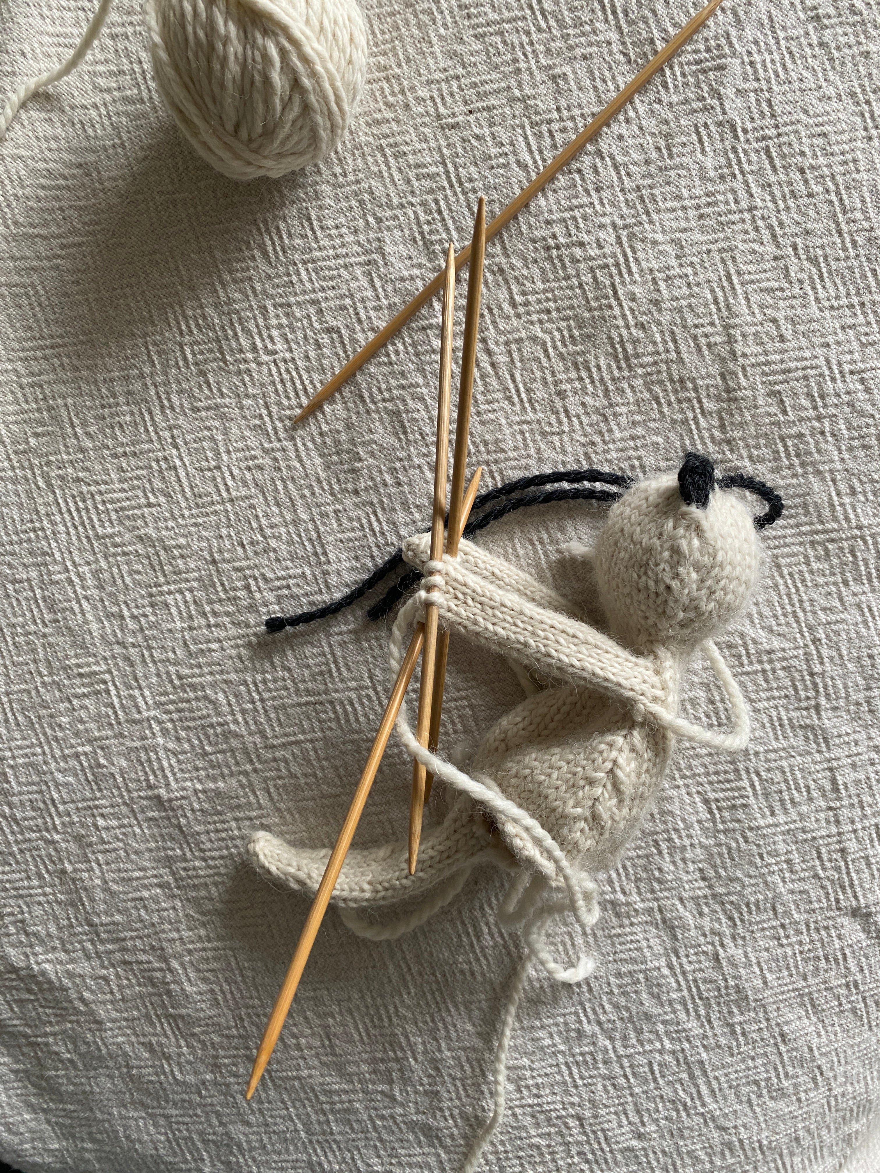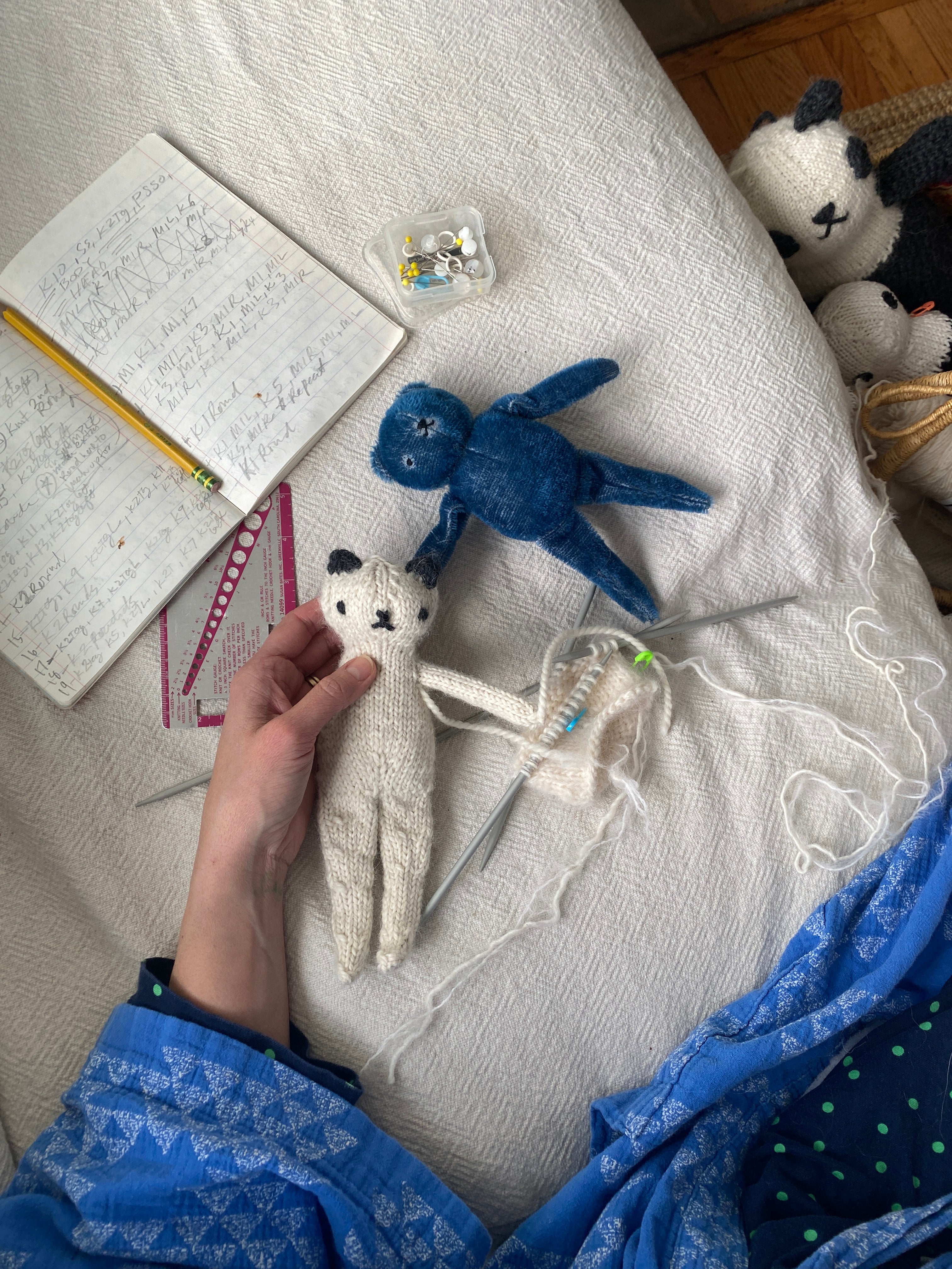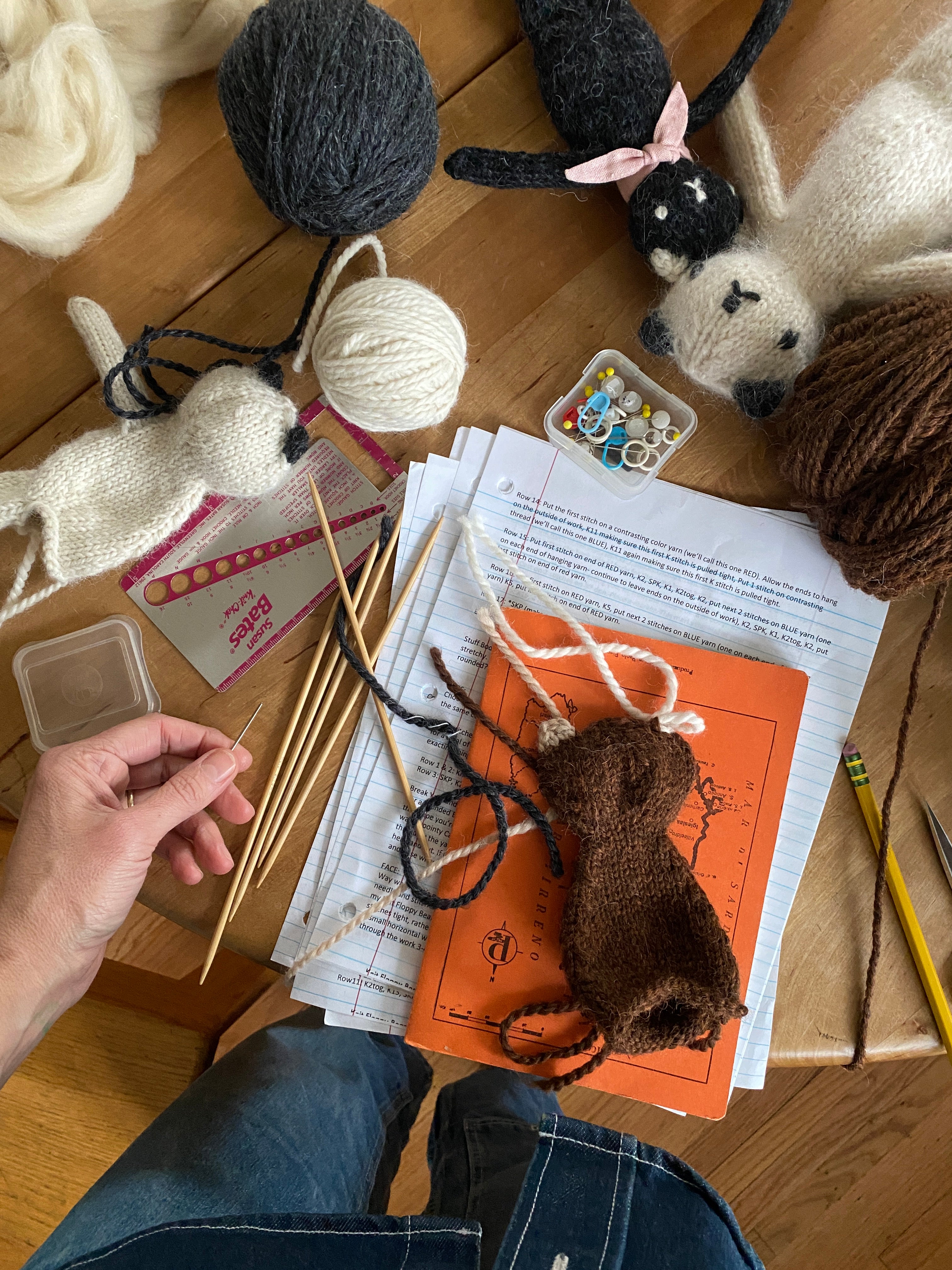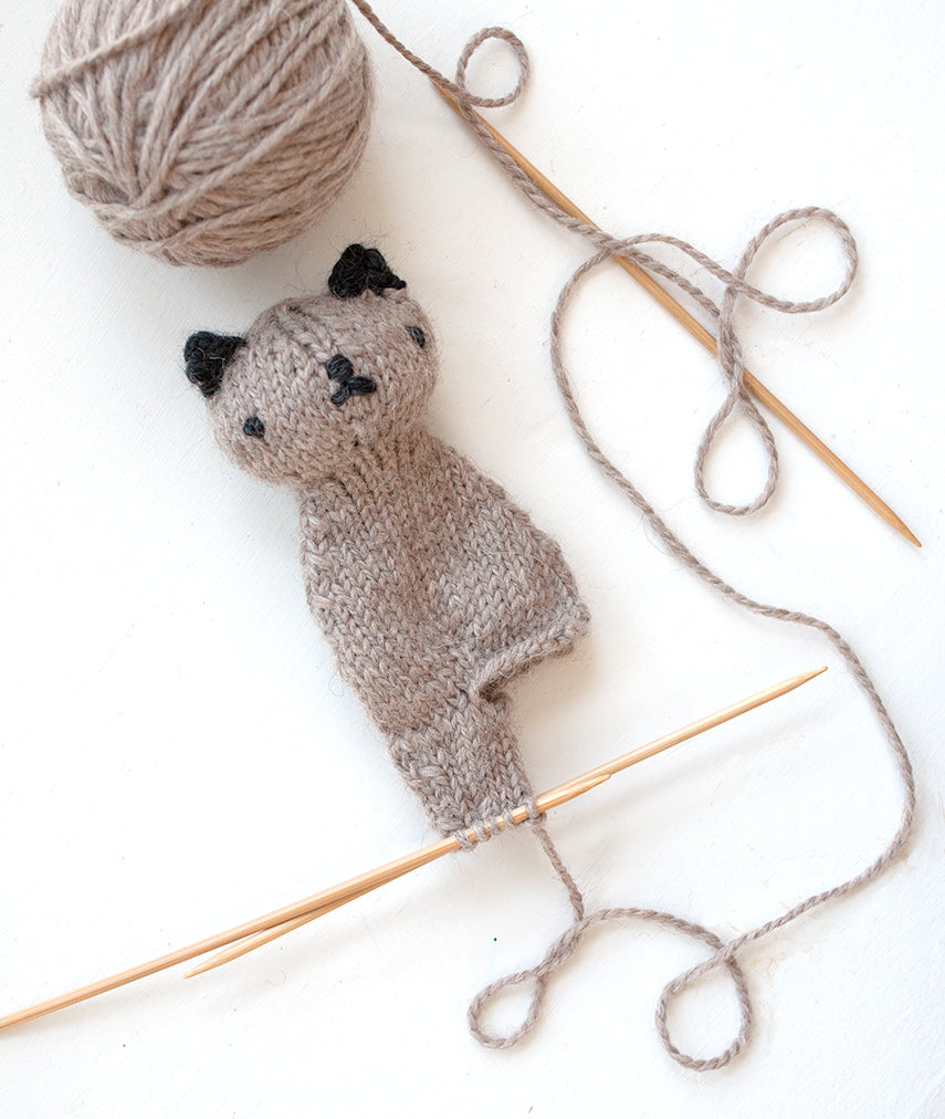 The joy in making this pattern, besides watching this small Bear or Cat take form, is it scales to the yarn and double pointed needles you have on hand. The trick is to use a heavier yarn or combination of yarns than would be the standard recommendation. Strike a balance of pleasure of knitting and density of stitches. My favorite choice is Berroco Ultra Alpaca Chunky, but rather than the recommended US 10 (6mm), I use US 5 (3.75mm) needles for this pattern. This yarn and needle combination creates a 9" tall Bear or Cat very similar in size and shape to the Polka Dot Club Mohair Floppy Bear, and the soft alpaca-wool blend holds up beautifully while being so very soft to the touch.