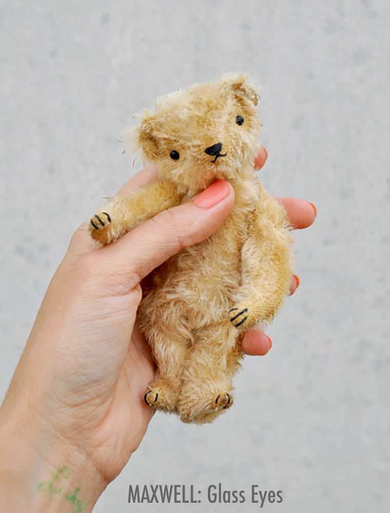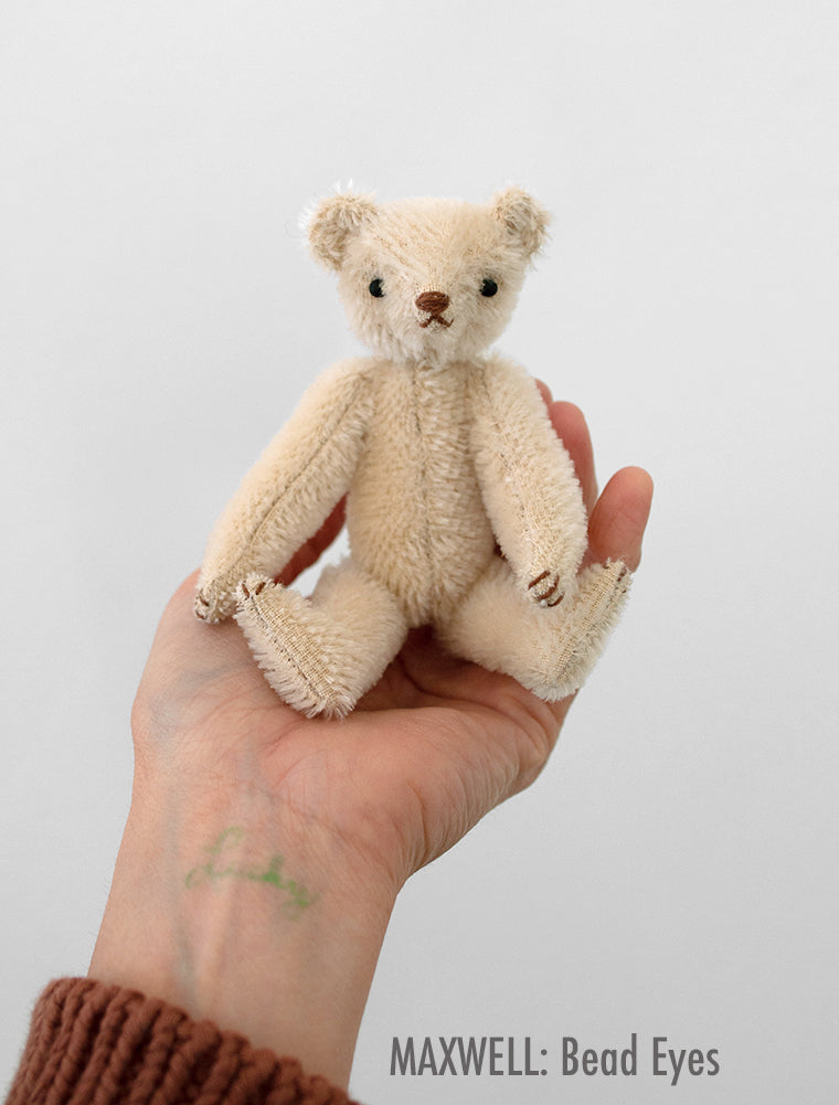 ADD GLASS EYES: Using glass eyes in place of beads is a step up in difficulty but creates a different and more polished finished bear. The eyes sit more flush with the fabric are and less "beady". See the difference in the images here.