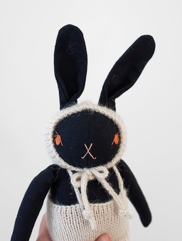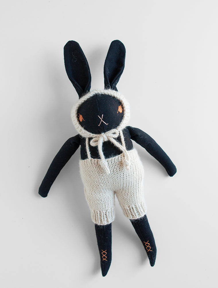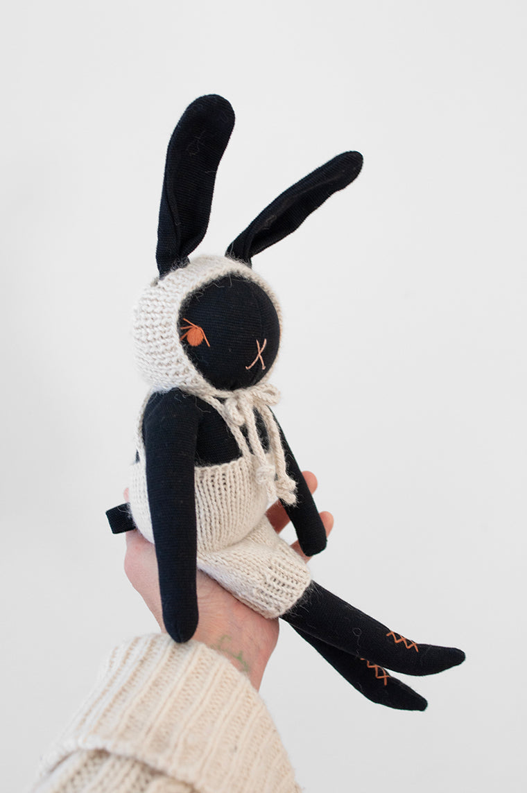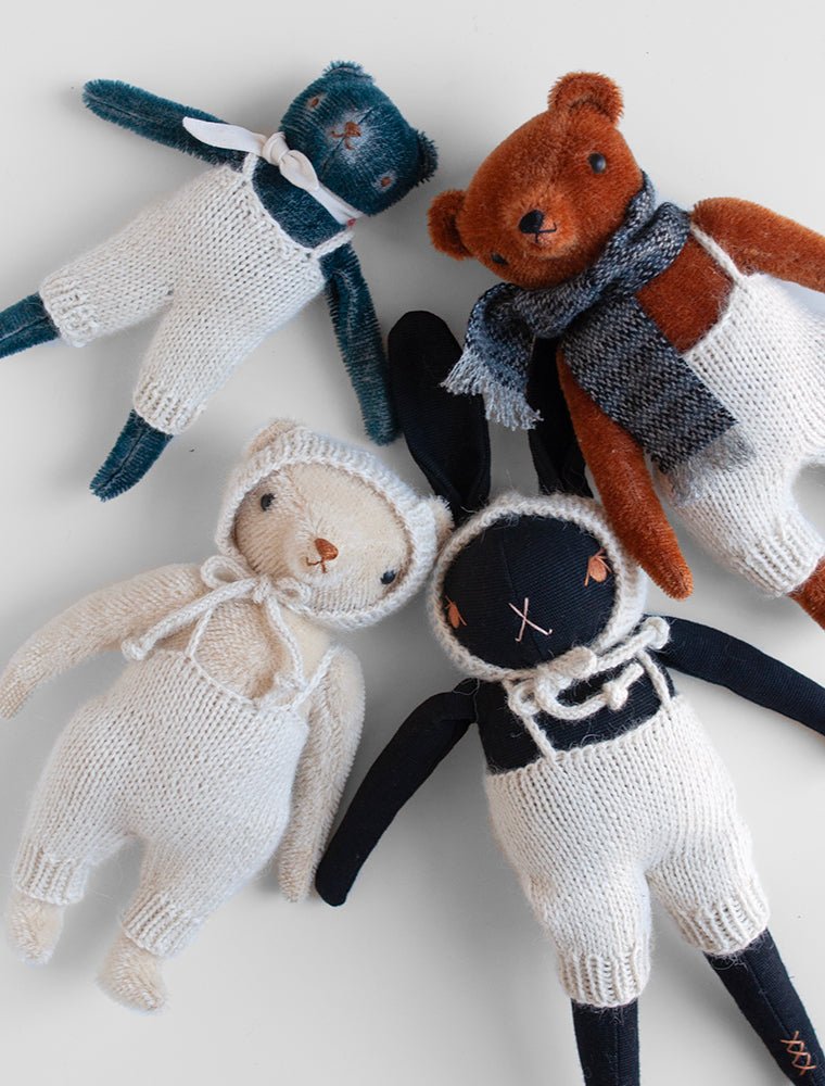 The Last of the Rabbits and Cats made in Peru- dressed in hand dyed woolen bonnets, ruffle dressed, and a wool scarf: