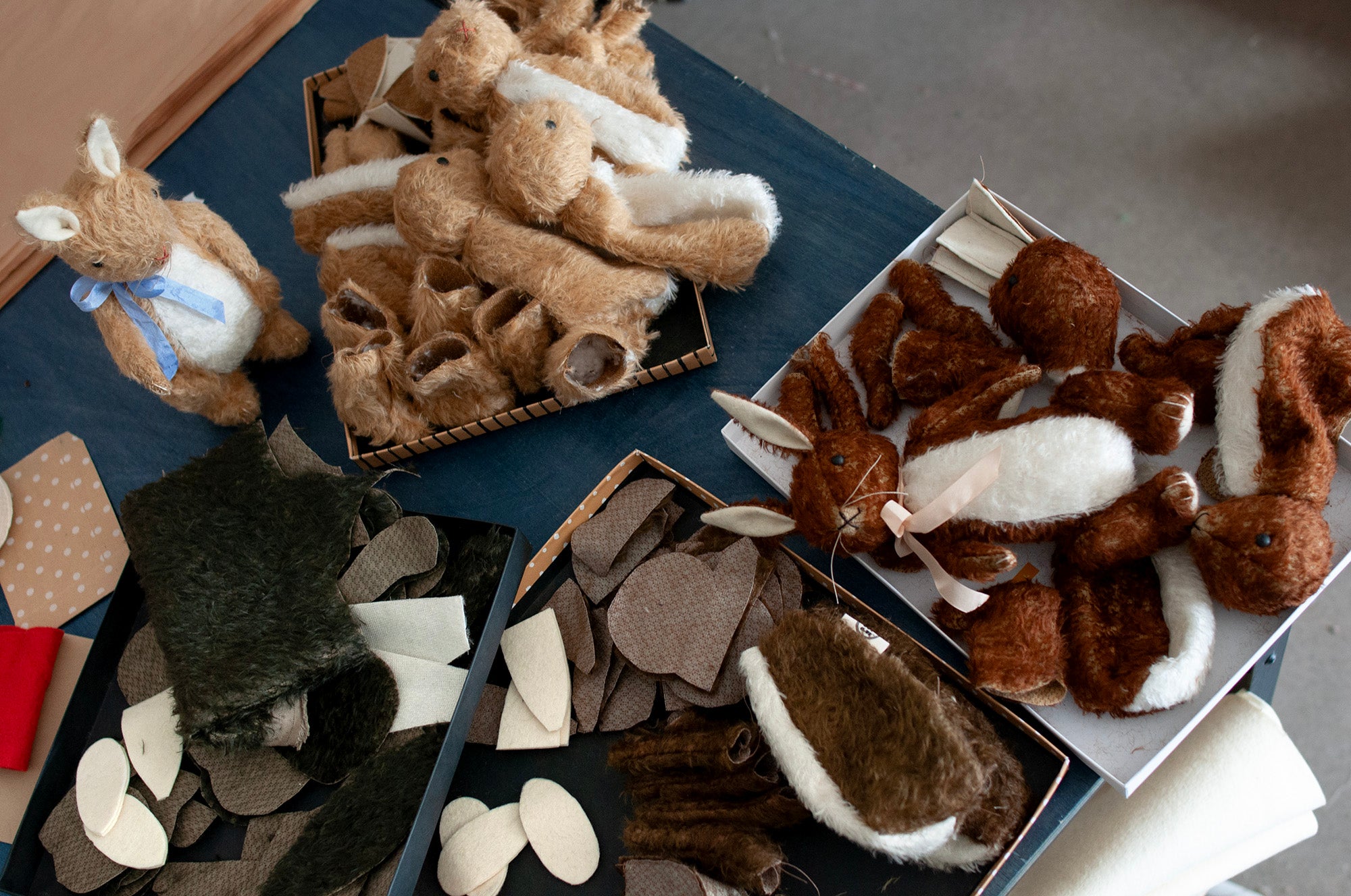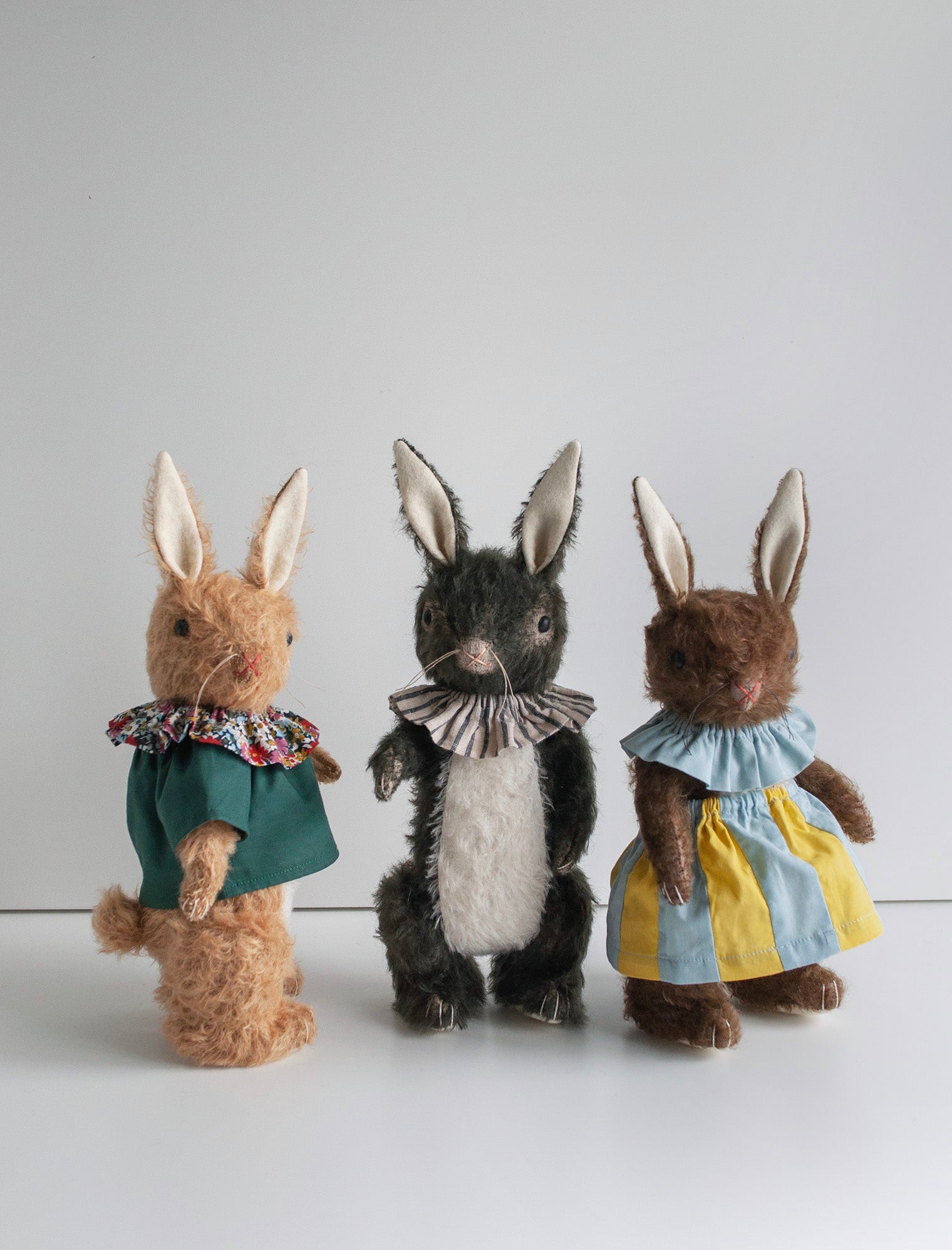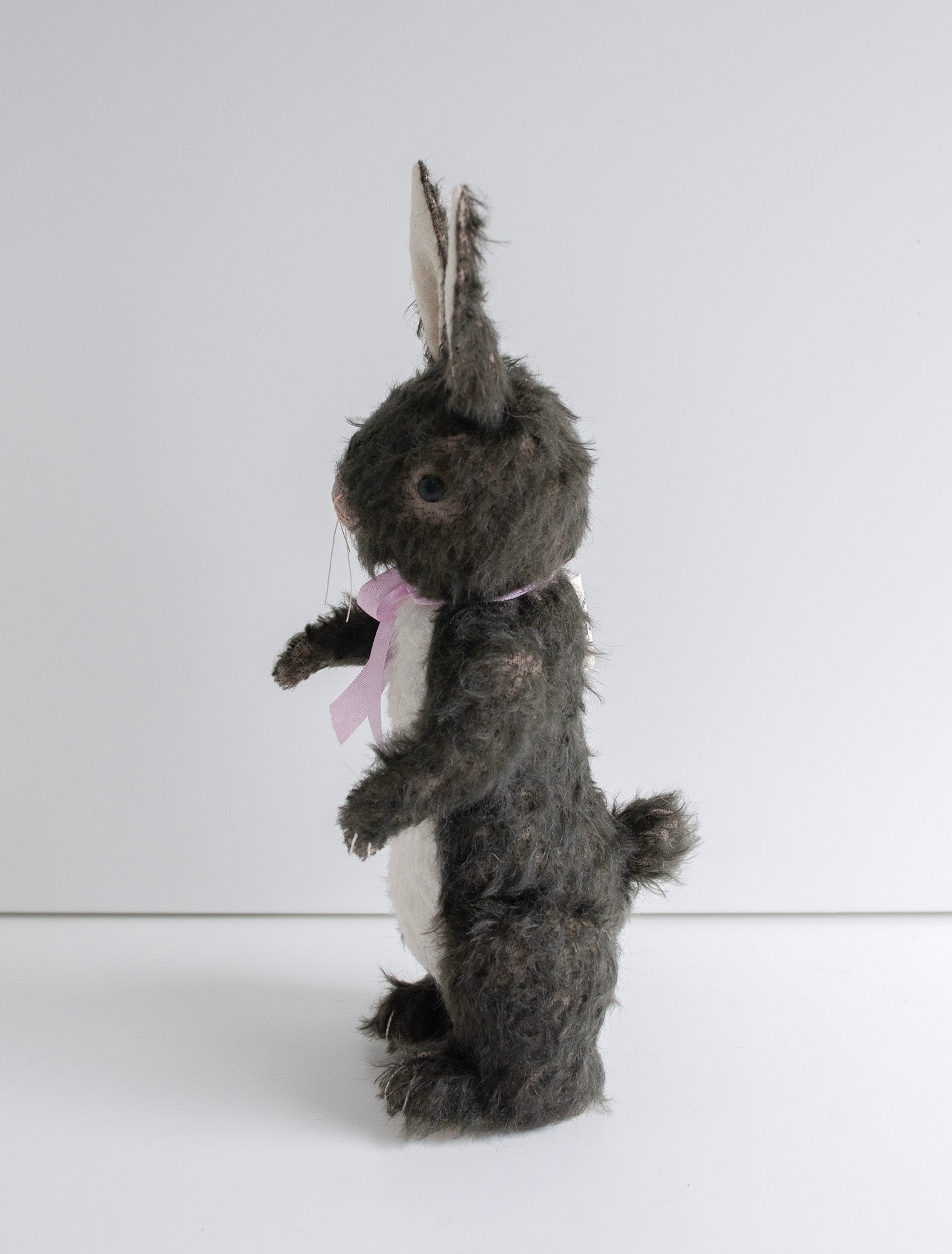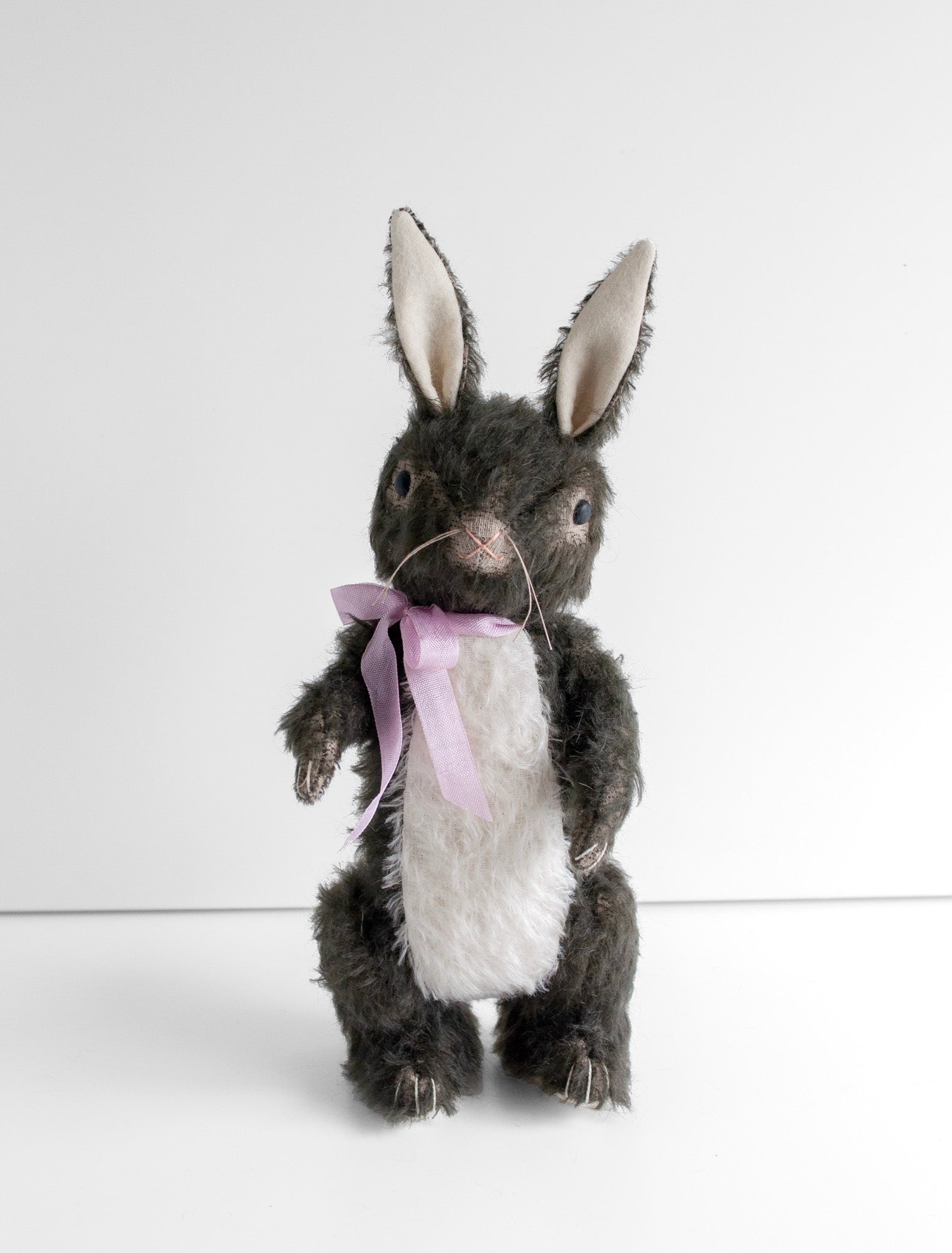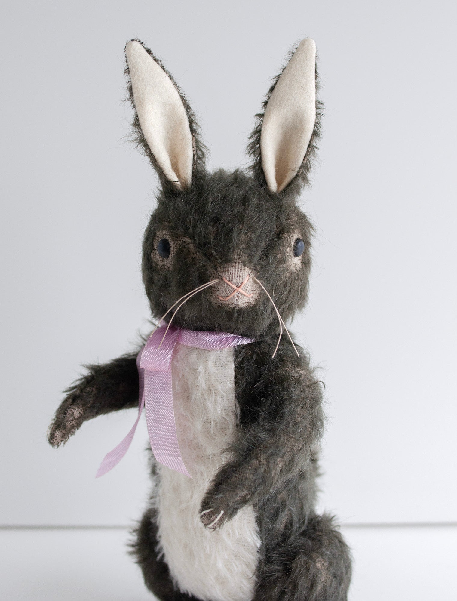 An old pattern, reinvented! Free standing (or sitting) Mohair Lookout Rabbit with safety eyes, fully jointed, hand embroidered, two colors of mohair and wool felt, with a slightly soft squishy belly.